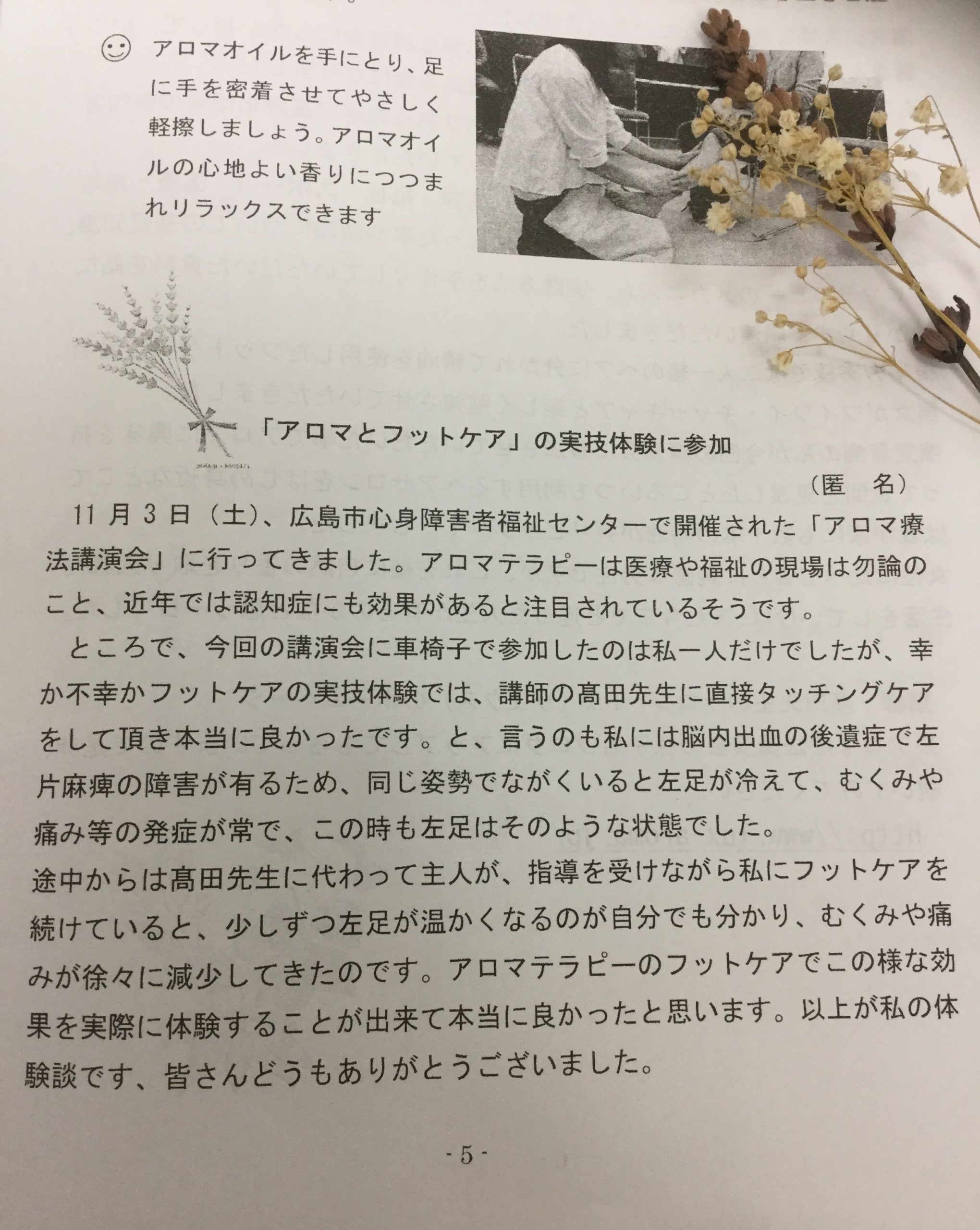 昨年、開催された”ひまわり友の会”主催の「アロマ療法講演会」 会報誌に掲載された感想をご紹介いたします。